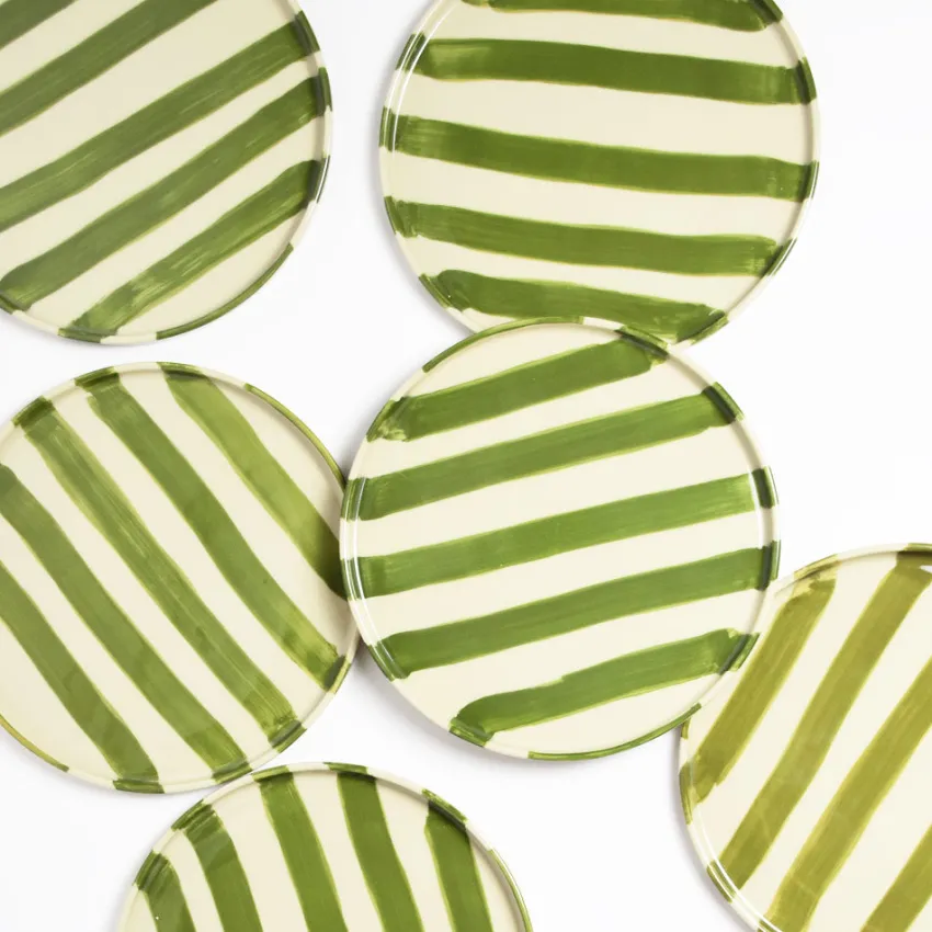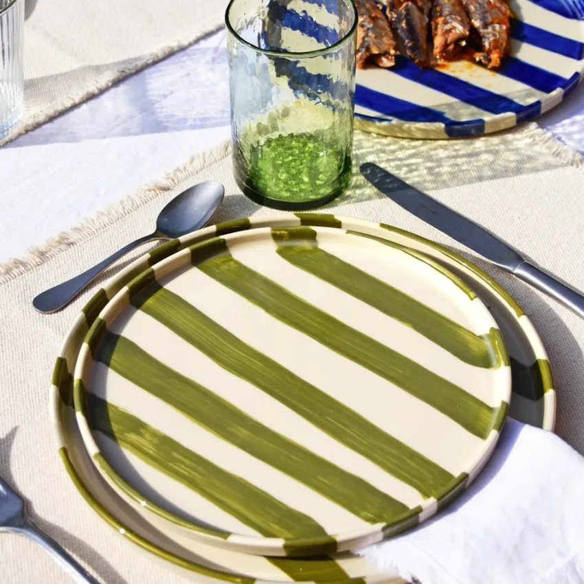 À l’heure du goûter, du dessert ou d’un déjeuner léger, la petite assiette Linhas trouve naturellement sa place. Ses rayures peintes à la main en font un basique pas si basique, à mixer ou empiler sans modération.