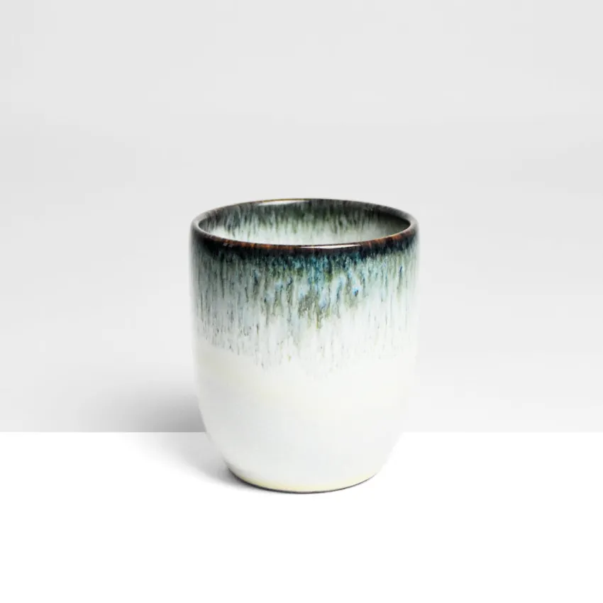 Émail : Un émail réactif appliqué par trempage laissant apparaître une coulure plus ou moins régulière. Les teintes de l’émail bleu verdâtre rappellent le rivage, le bleu de l’océan associé au beige / blanc des longues plages.