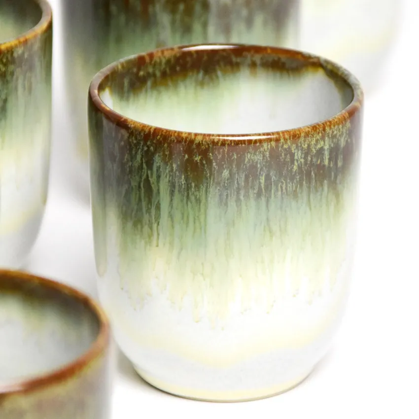 Émail : Un émail vert kaki réactif appliqué par trempage laissant apparaître une coulure plus ou moins régulière sur le haut de la pièce, associées à un émail blanc / beige aux couleurs de l’argile sur le bas de la pièce.
