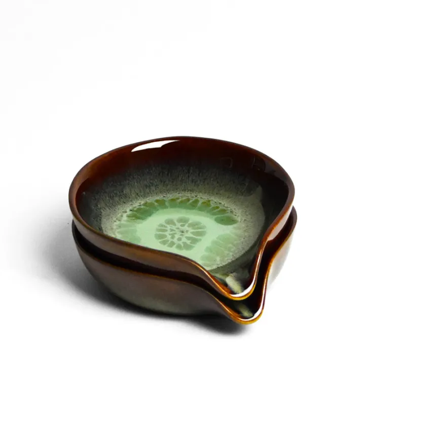 Émail : Un émail vert kaki réactif légèrement acidulé avec des effets mouchetés à l’intérieur, agrémenté d’un liseré marron plus ou moins foncé sur le rebord de la pièce.