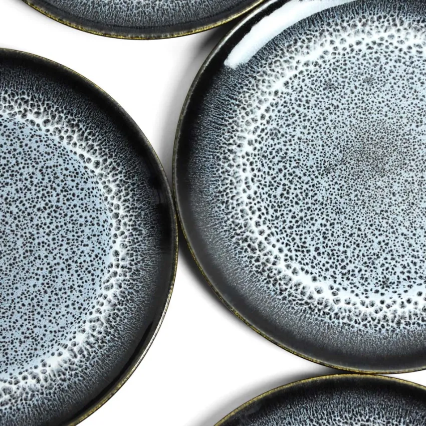 Émail : Un émail noir mat sur l’extérieur des pièces avec des effets réactifs blancs / bleutés brillants sur l’intérieur.