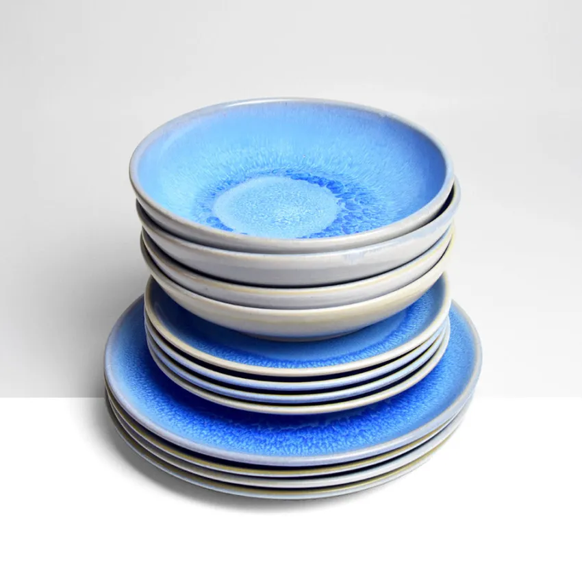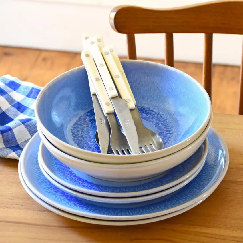 Émail : Un bleu profond, entre lapis et azur, qui prolonge l’été sur vos tables. Chaque pièce révèle des effets de matière uniques, entre éclat brut et douceur minérale.