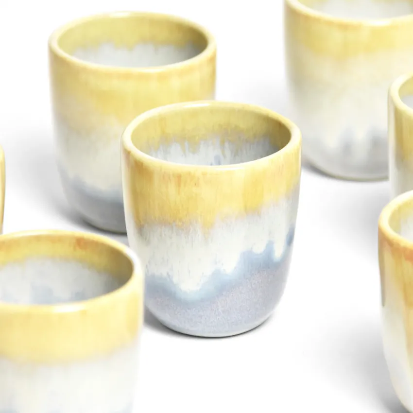 Émail : Un émail jaune réactif appliqué par trempage laissant apparaître une coulure plus ou moins régulière sur le haut de la pièce, associées à un émail blanc / beige aux couleurs de l’argile sur le bas de la pièce.