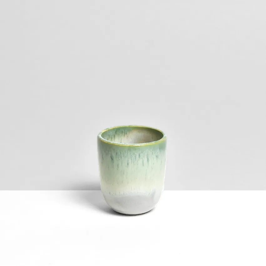 Émail : Un émail vert clair réactif appliqué par trempage laissant apparaître une coulure plus ou moins régulière sur le haut de la pièce, associées à un émail blanc / beige aux couleurs de l’argile sur le bas de la pièce.