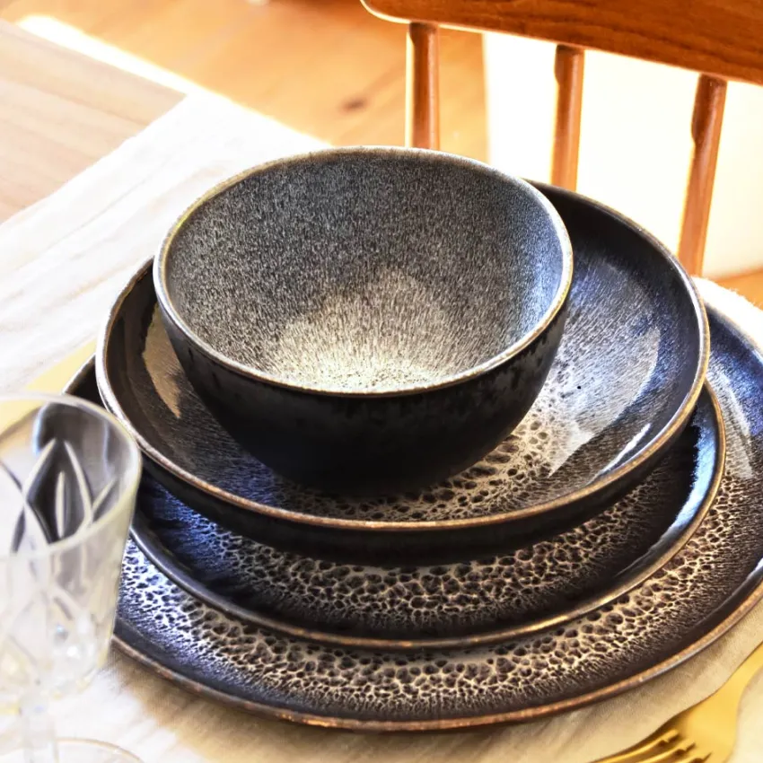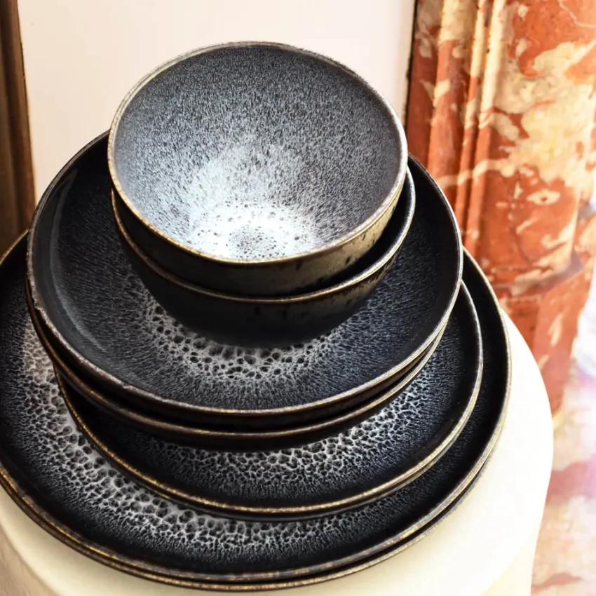 Émail : Un émail noir mat sur l’extérieur des pièces avec des effets réactifs blancs / bleutés brillants sur l’intérieur.