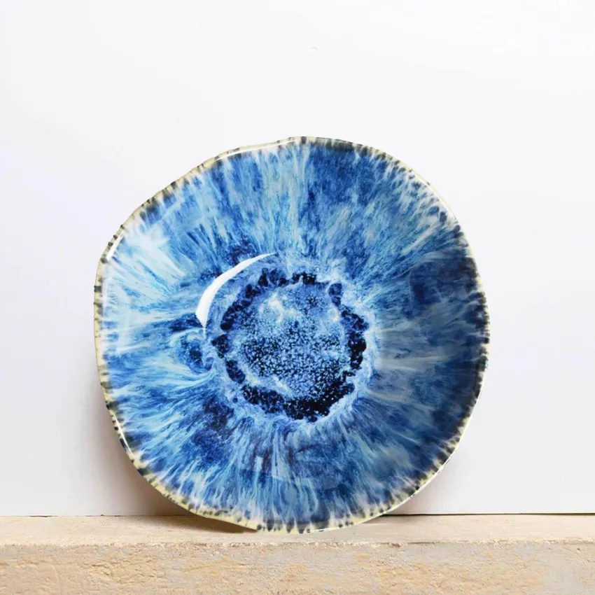 Émail : Le Bleu Écume capture le mouvement de l’eau et la lumière changeante des vagues. Les nuances se fondent en transparences et dégradés, évoquant le va-et-vient de la mer sous le soleil.